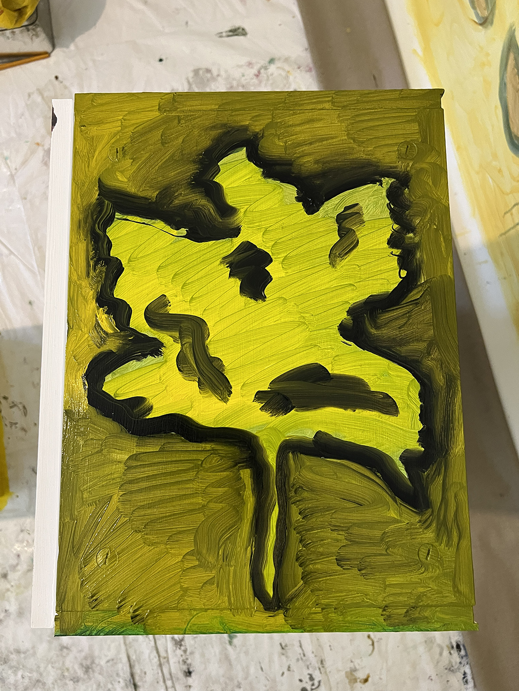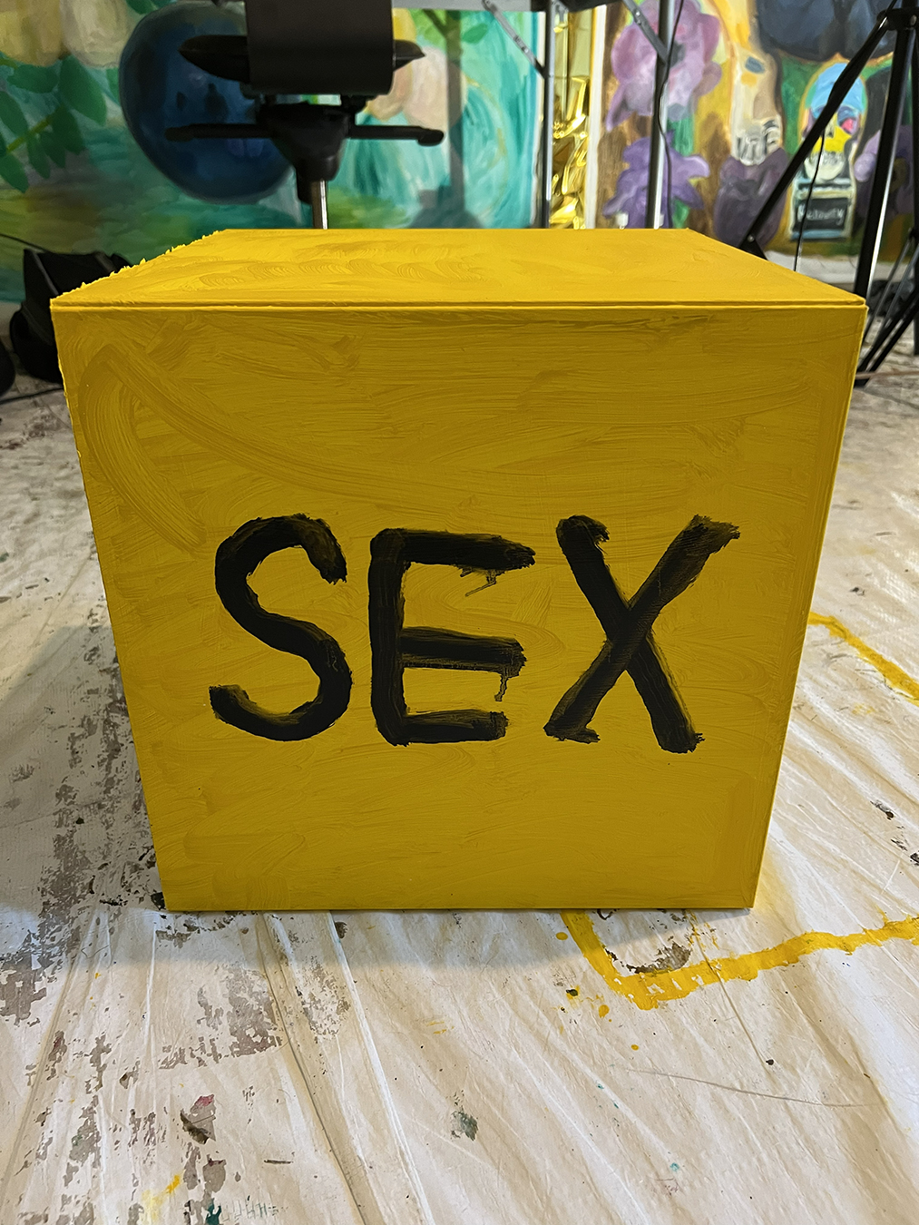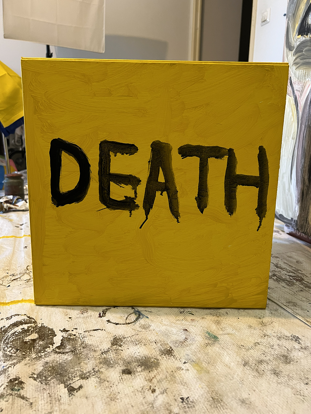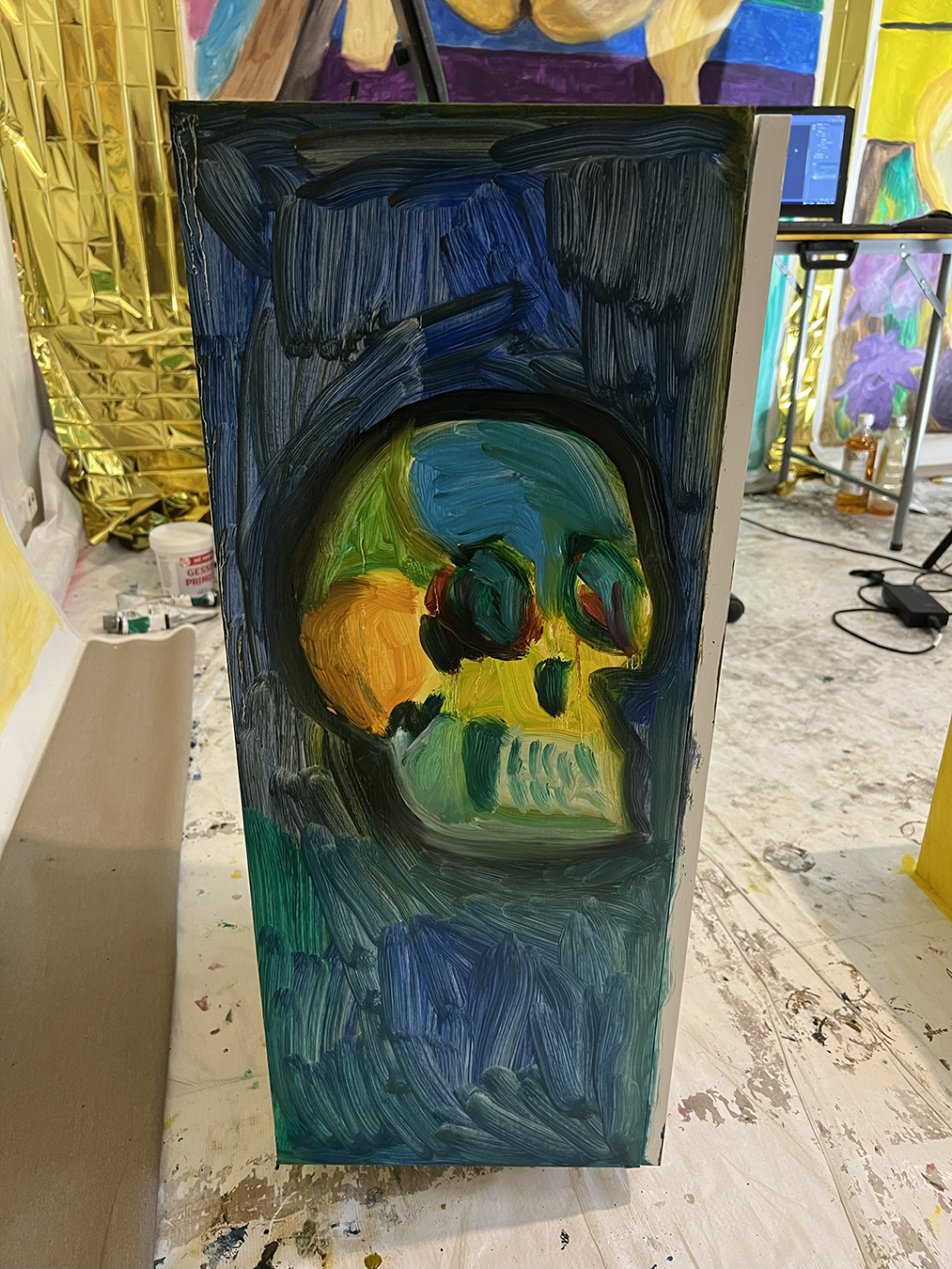 Plastic medical skull and IKEA EKET cabinet designed by Jon Karlsson primed and painted with oil paint