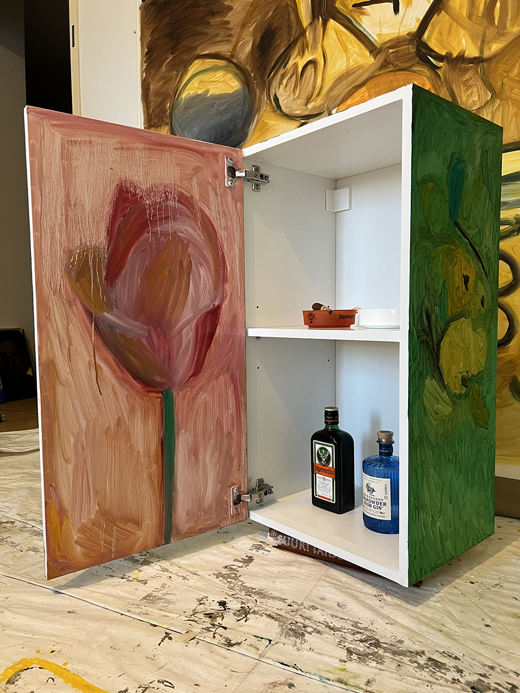 Orange Jägermeister ashtray, white ashtray, smoked cigar, used matches, Jägermeister 0,5l bottle, Drumshanbo Gunpowder Irish Gin 0,5l bottle and IKEA KNOXHULT wall cabinet and door primed and painted with oil paint