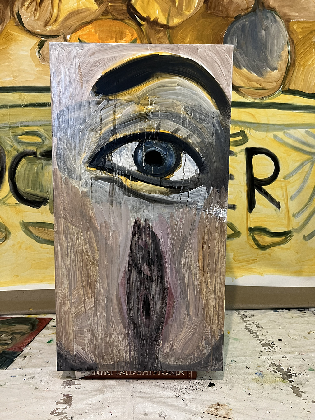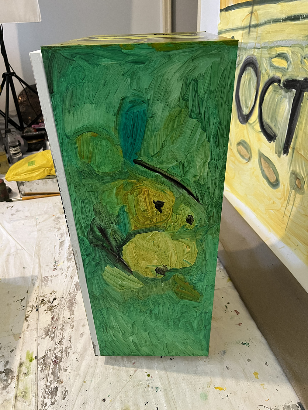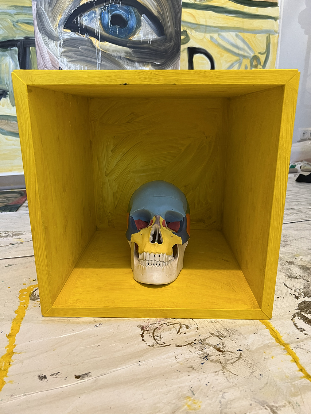 Plastic medical skull and IKEA EKET cabinet designed by Jon Karlsson primed and painted with oil paint